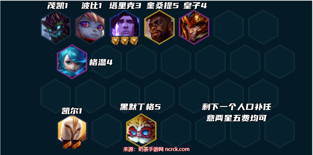 选择自然升到5人口后,可以随意添加一张卡牌上场,一般选择堡垒卫士。这个阵容注重无脑发育,不需要过多考虑补充人口。记得保留备战席上的天使和堡垒卫士即可。