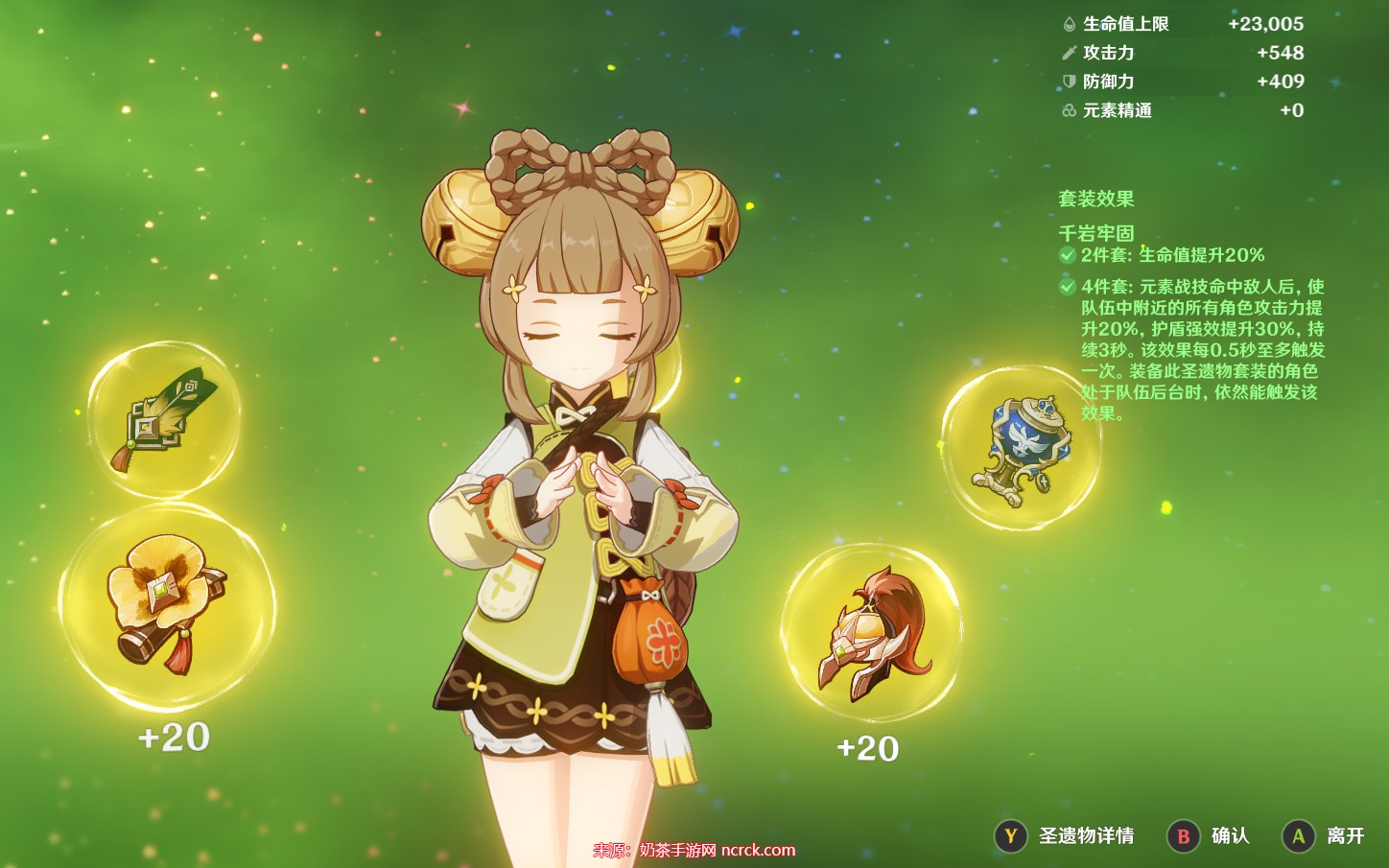 2、千岩四件套:千岩四件套提升20%的生命值,也增加了瑶瑶的治疗量。四件套效果可以稳定触发,并提升队友20%的攻击力,适用于大多数队伍。