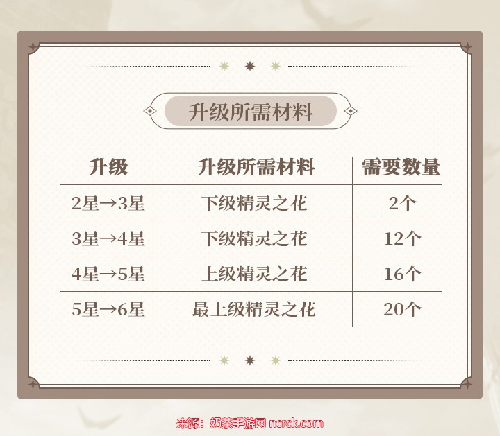 精灵之花是角色升星过程中必不可少的材料。不同级别的角色升级所需的精灵之花类型和数量也各不相同。以下是各级别角色升级所需的精灵之花类型和数量的总结,供您参考: