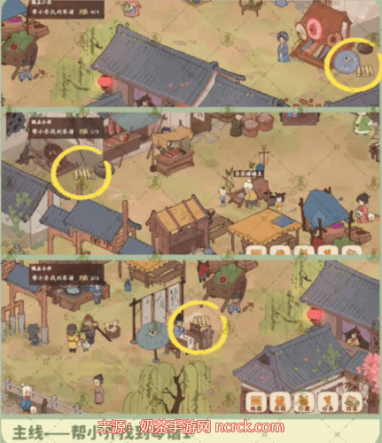 主线任务3:帮助小乔找到琴谱1 在集市的三个地方,您可以找到小乔需要的琴谱1。根据图示指引,前往这些地点,找到琴谱并交给小乔。