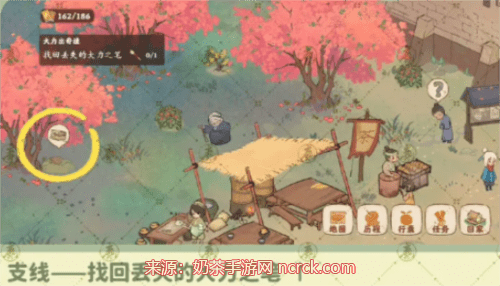 支线任务1:找回丢失的大力之笔 在集市中的上方左侧桃花树下,您将找到丢失的大力之笔。在游戏中点选该位置,快速找到并归还大力之笔。