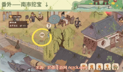 番外任务1:南市挖宝任务 位于市场河边的柳树旁,您可以找到南市挖宝任务的宝藏。仔细搜索该位置,找到并收集宝藏。