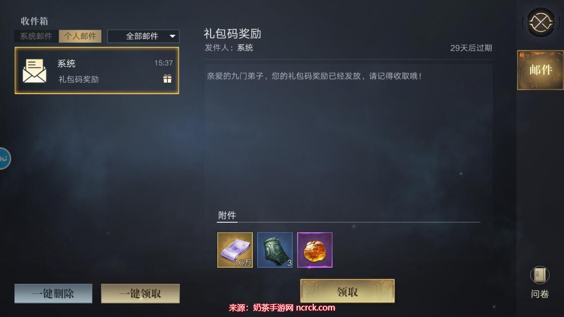 5、在邮箱中,你将看到礼包码奖励的内容。点击"领取"按钮即可获取奖励。