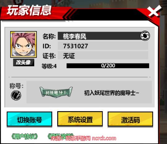 2、点击左上角的头像,进入玩家信息界面,然后点击激活码按钮。