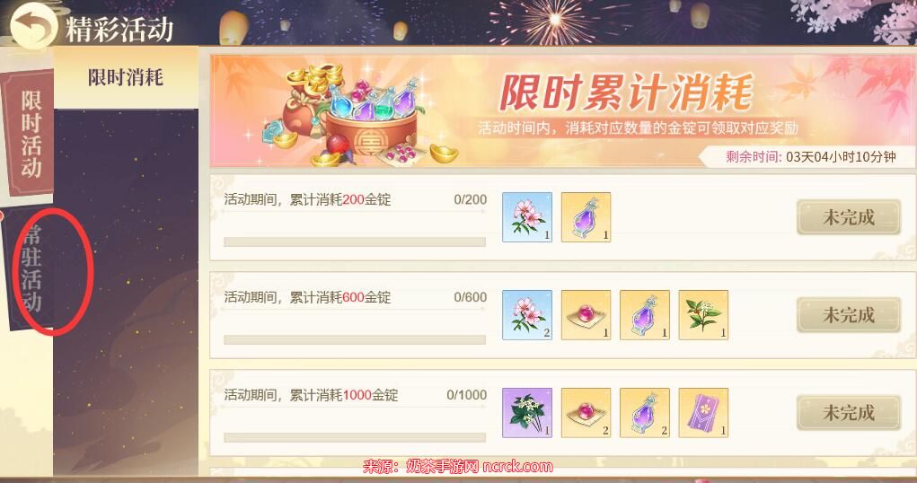 2、进入活动界面后,在左侧选择"常驻活动"。
