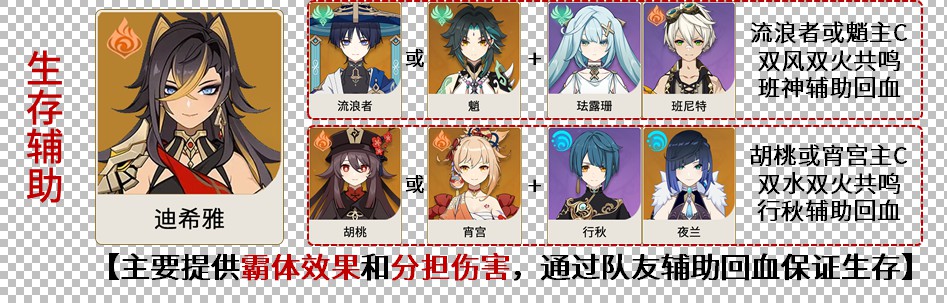优点:这个阵容中,迪希雅能够独自完成后台挂火和抗打断两个功能,因此可以节省一个位置。