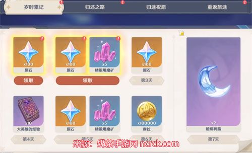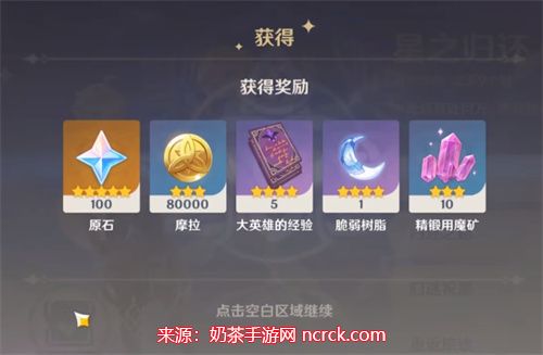 【归还奖励】:点击后可领取100原石、8W摩拉、5本大经验书、1脆弱树脂、10矿石。