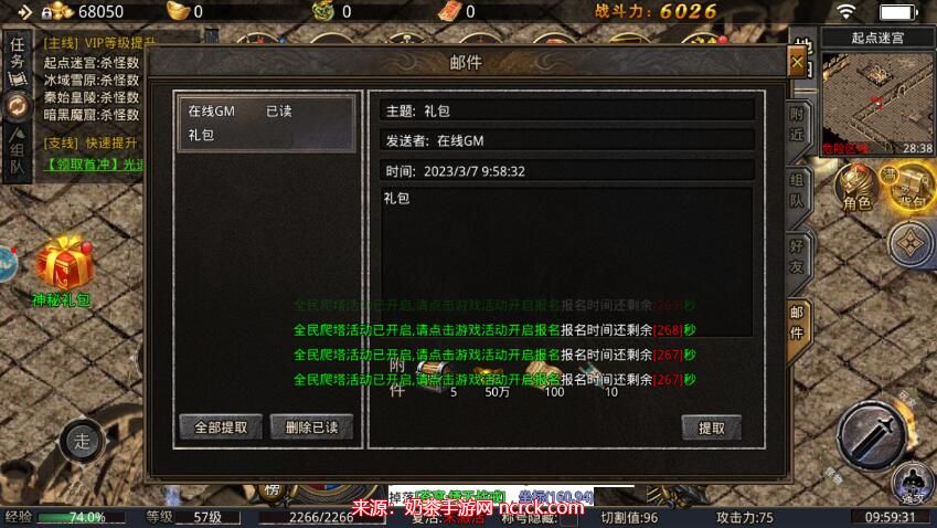 5、在邮件界面中,点击提取即可领取兑换码所提供的礼包奖励。