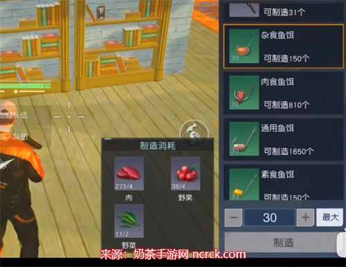 1、首先,您需要准备肉 * 4,野果 * 4,野草 * 2,以制作杂食鱼饵。只有使用杂食鱼饵,才能钓到大口黑鲈。