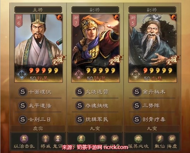 当觉得队伍没有在4回合内秒杀敌人的能力,但自己又具备很强的抗打能力时,可以使用这套兵书组合。示敌以弱将使得十面埋伏的触发概率提升到38%,而在第5回合时,程昱的触发概率又增加了7%,使得十面埋伏的触发概率达到45%。