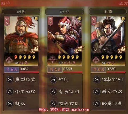 甘宁携带技能万箭齐发和避实击虚,能够迅速造成范围伤害和单体暴击,提供高额伤害输出。太史慈则使用暴戾无仁和弯弓饮羽,利用甘宁的会心加持,能够爆发出极高的输出。程普的技能盛气凌敌和白马义从使他成为阵容中的坦克,能够吸引敌人的攻击,同时提供一定的输出能力。