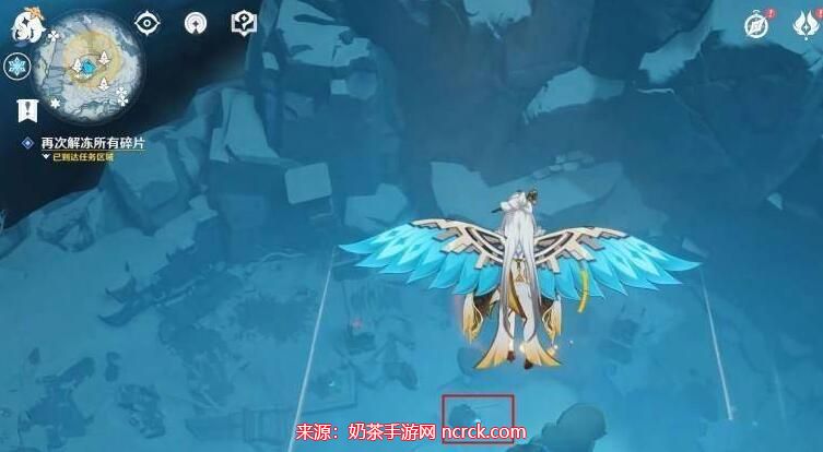 4、继续向山的背后攀爬,点亮风元素柱,在第三个平台上往下飞,就能看到第三个冰块。