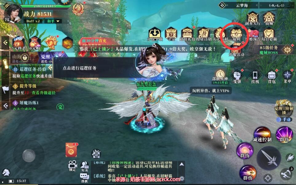 1、打开昆仑劫手游并进入主界面,点击右上方的福利按钮。