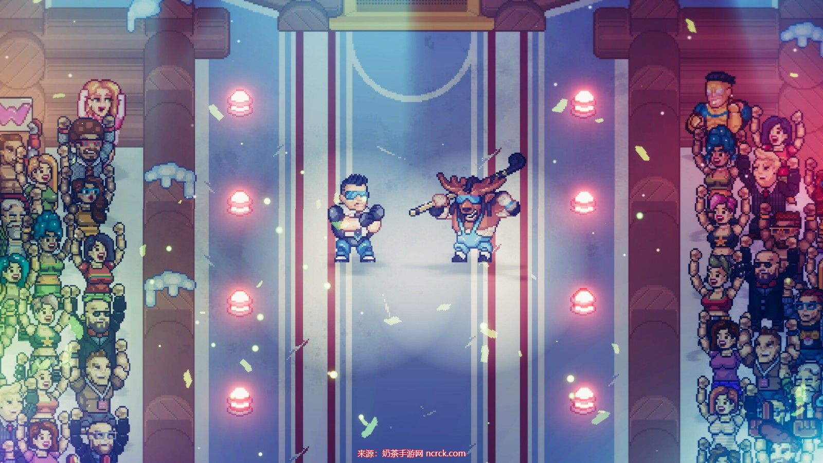 当职业摔角与角色扮演游戏碰撞,绚丽的火花就会迸发。炸弹摔和打桩摔将引领你踏入宏大的像素艺术世界。