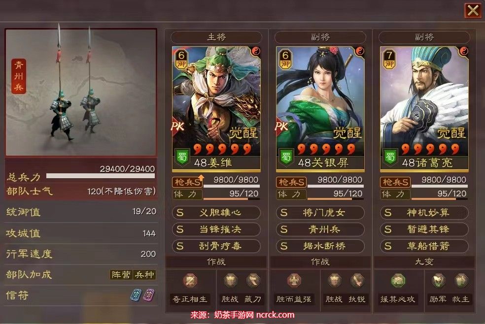 姜维的战法搭配为“夺魂挟魄”和“杯蛇鬼车”,能够迅速削弱敌人的防守和输出能力。关银屏的战法搭配为“横扫千军”和“箕形阵”,提高了她的输出和防御能力。赵云的战法搭配为“草船借箭”和“抚辑军民”,提供了额外的输出和控制能力。