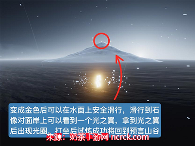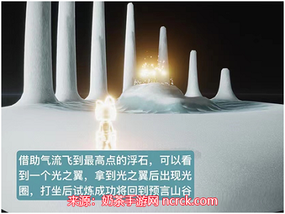 收集方法:利用气流的推动,飞到浮石的最高点,你会发现一对闪烁的翅膀。获取这对光之翼后,又将出现一个光圈。再次冥想后,若成功通过试炼,你将回到预言山谷。