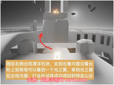 收集方法:随后,你会发现右侧出现了漂浮的石块。穿过石像,沿着台阶上升至高塔之巅,你将会发现一对闪耀的翅膀。拿到这对光之翼后,又将出现一个光圈。再次冥想后,若成功通过试炼,你将回到预言山谷。