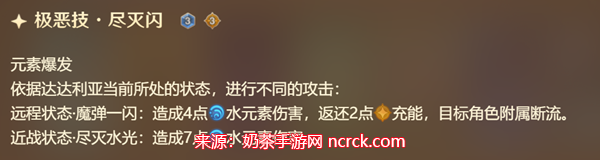 远程状态·魔弹一闪:造成4点水元素伤害,返还2点充能,目标角色附属断流。