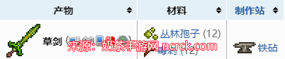 合成草剑需要丛林孢子和毒刺各12个,收集完所需材料后可在铁砧或铅砧上合成该装备。