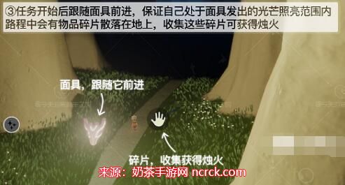 3、接着,我会跟随面具前进,只需要待在面具发出的光芒范围内,就能看到地上散落的物品碎片,收集这些碎片就能获得烛火。