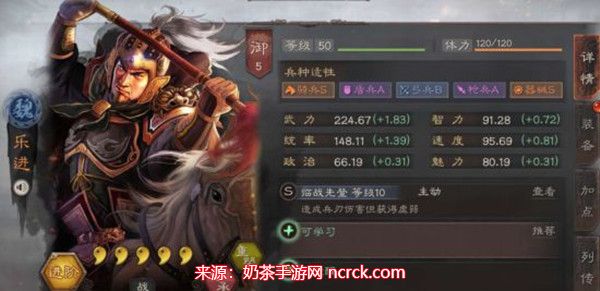 乐进在兵种适应性方面表现不错,擅长骑兵和枪兵,盾兵方面也有一定水平。他的武力成长为2.06,智力成长为0.72,统率成长为1.77,速度成长为1.17。