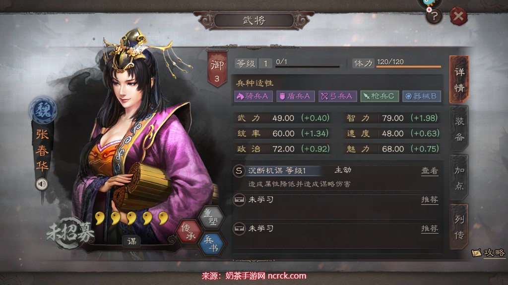首先看属性,除了智力出众外,她的统御刚刚及格,而武力和速度则较低,可以说她更适合担任谋臣角色。在兵种方面,她擅长骑兵、盾兵和弓兵,但在枪兵和器械方面表现较差。她拥有自带战法,能以40%的概率发动瞬发战法,该战法能够最大程度地降低对手两人30%的智力和统帅,并造成相当可观的谋略伤害,非常可怕。