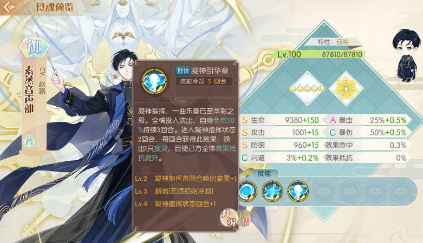 作为蓬莱国君的芸香烹馏乐魂部面色冷淡,举止雅致,身穿绣有华美唐朝图案的服饰,腰佩镀金镂空花鸟球形银香囊。其身后跟随着由其精神力幻化而生的,形如蓬莱仙子的音乐使灵,既是国君身份的崇高象征,也是其最忠诚的随从。因为诞生于唐代歌舞宴席文化之中,他天生拥有非凡的音乐才能,不仅擅长演奏多种乐器,还能指挥乐团演奏。凝聚了数十位声音之灵的力量,他具备将音乐具体化的强大能力,能够真实地呈现出音乐传达的意境给观众。然而,外表上冷漠而不可亵渎的蓬莱国君,在独处时也会展示出不为人知的一面,但他高傲的性格和极度的自尊心不允许他将这一面展示给他人。