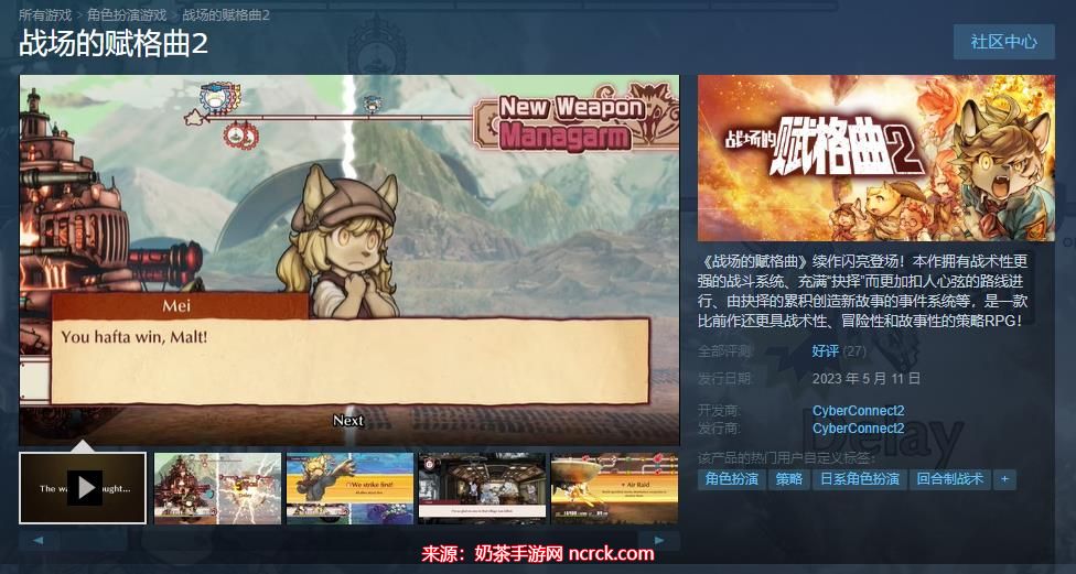 由CyberConnect2开发的“福瑞”策略RPG《战场的赋格曲2》现已正式发售,登陆PS5、PS4、Xbox Series X|S、Xbox One、Switch、PC和XGP,暂不支持中文,Steam版售价206元,该作是2021年游戏《战场的赋格曲》的续集,讲述了前作一年后发生的全新故事。