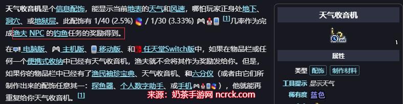 天气监听器是一种信息配饰,可以显示当前地表的天气和风速,即使玩家身处地下、洞穴或地狱层也能使用。获得这个配饰的机会是每完成一次渔夫NPC的钓鱼任务时,约为1/40(2.5%)或1/30(3.33%)。