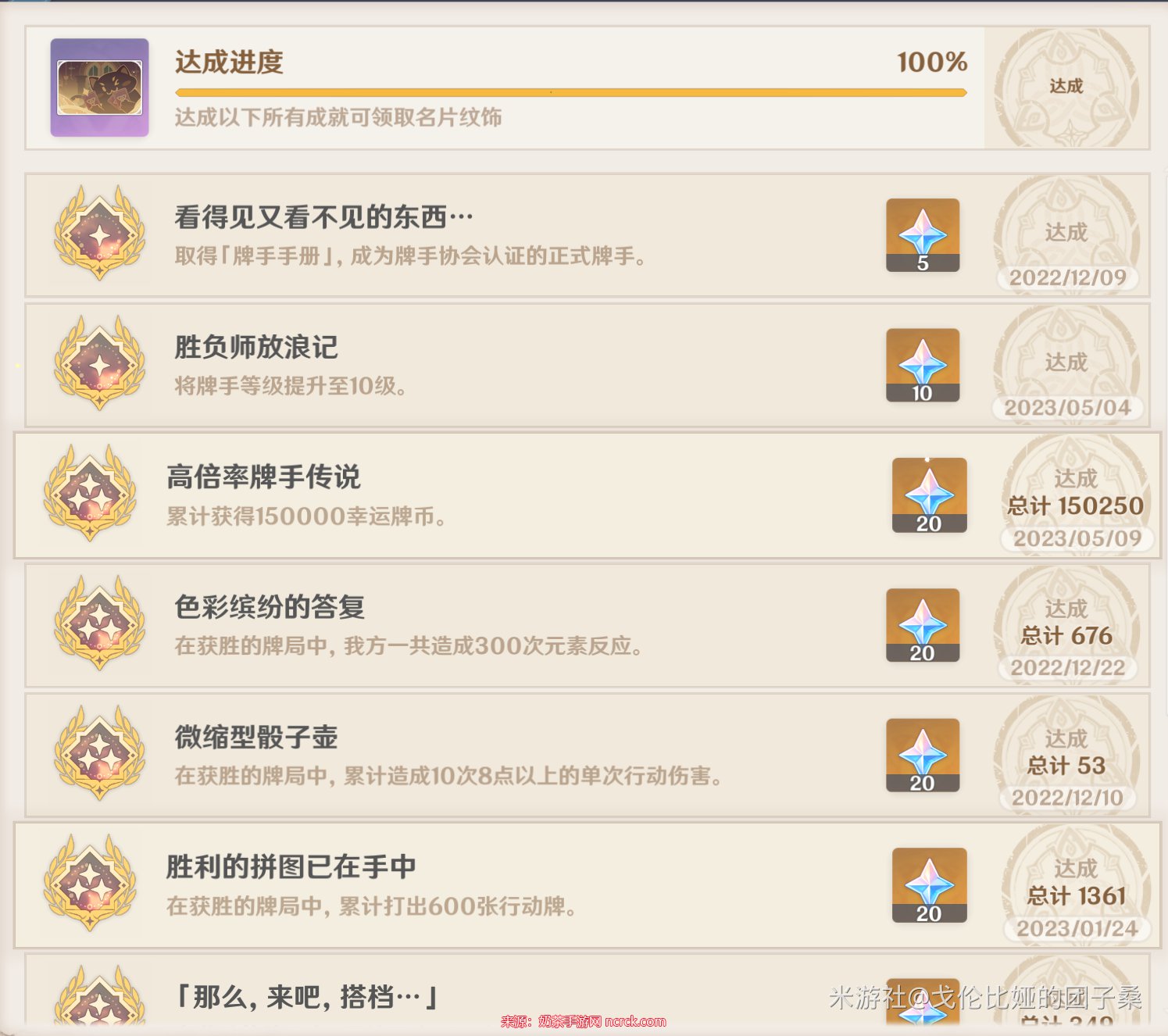 4、色彩缤纷的答复(三段成就):在获胜的牌局中,共触发{param0}次元素互动。