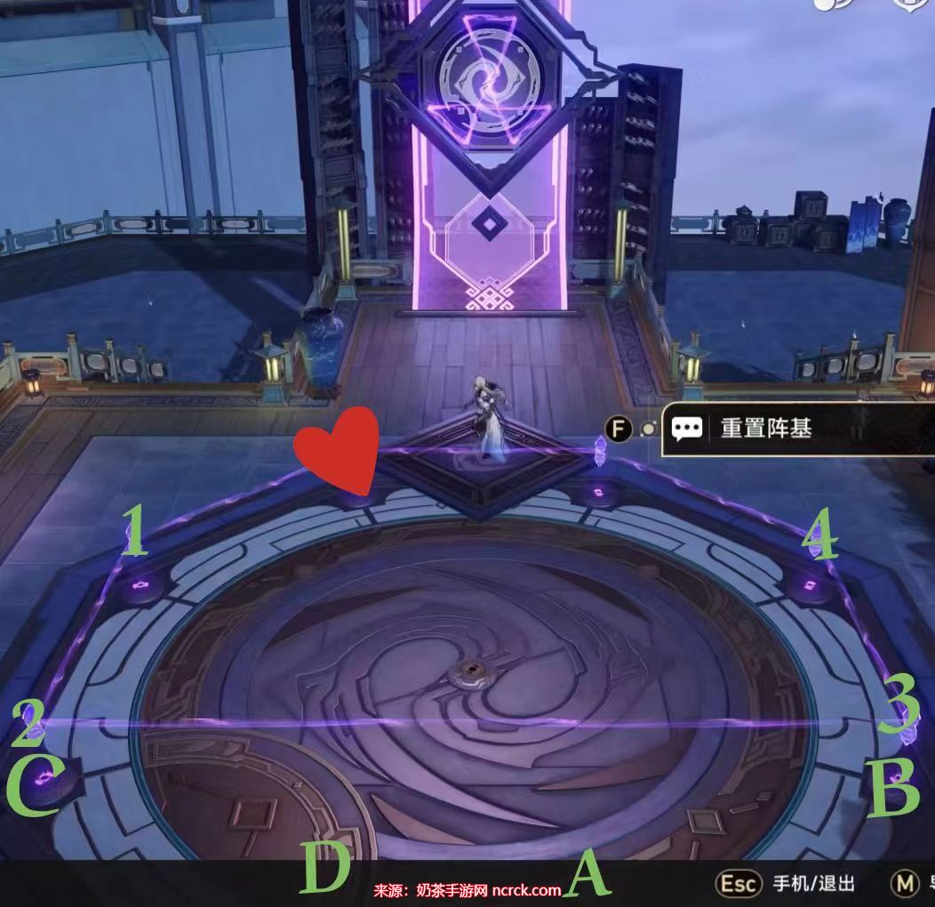 将1号水晶放置于A处,然后将2号水晶放置于B处,接着将3号水晶放置于C处,最后将4号水晶放置于D处。完成图示如下: