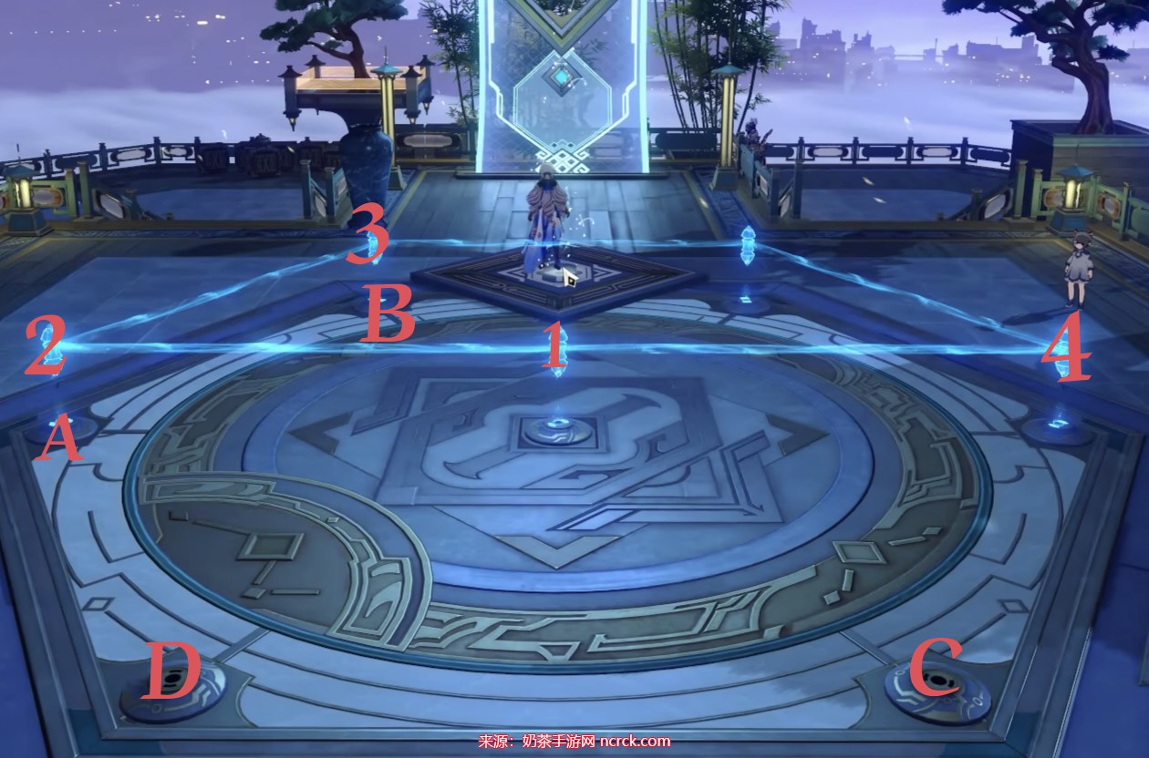 首先将1号水晶放置于A处,然后将2号水晶放置于B处,接着将3号水晶放置于C处,最后将4号水晶放置于D处。完成图示如下: