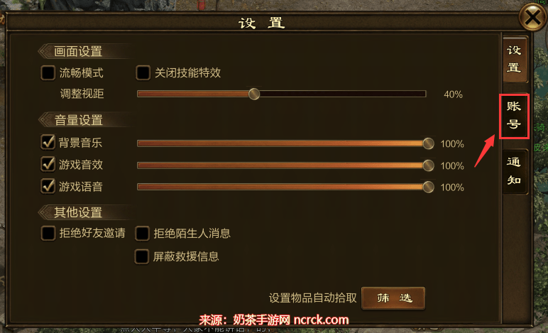 3、点击打开游戏设置,并切换到账号设置;