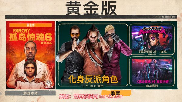 黄金版售价为99.99美元,包含游戏本体和一个季票。季票包括了三个DLC和一款游戏《孤岛惊魂 3:血龙》。这个版本适合那些想要更多游戏内容和更好游戏体验的玩家。