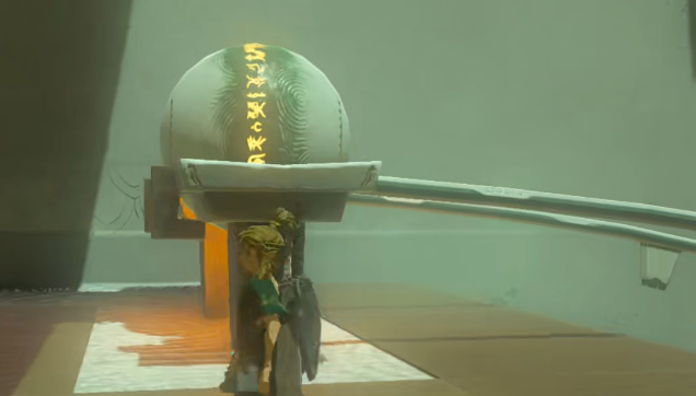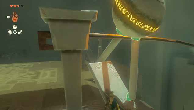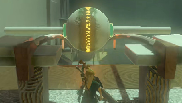 3、然后在瑟瑟利亚神庙的轨道上选择一个圆石,将其放置在轨道上,然后使用武器将其击打,圆石就会滚落下方。