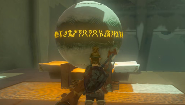 4、接着,在拉内尔神庙到达圆石的位置,玩家需要将圆石放入相应位置中,再次击打后,圆石就会滚落下方。