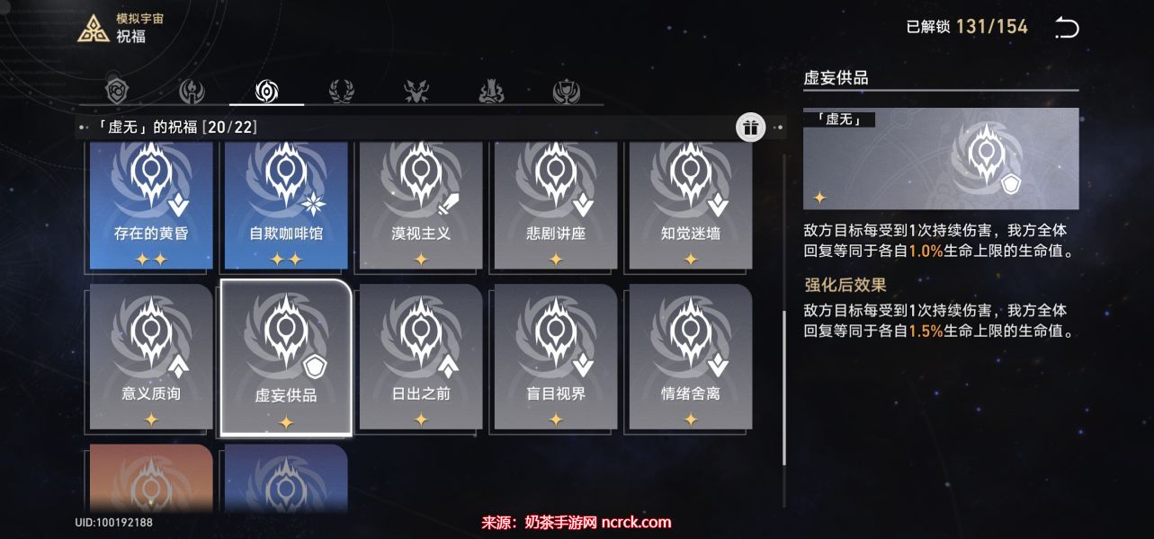除了伤害输出之外,我们还需要考虑一些回复手段,最好获取到1星虚无祝福的回血效果,以缓解娜塔莎的回血压力。