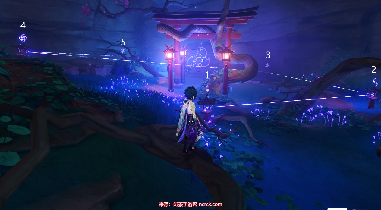 6、放入镇物后,按照上面图片标的1-2-3-4-5调整好各石台上勾玉的数量,然后1号点亮,开启机关后出现【落武者】,击败它,完成任务获得奖励