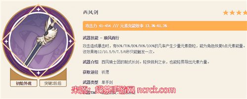 西风剑:充能武器,提供高额元素充能效率,保证大招循环。