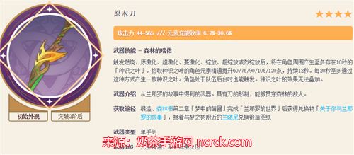原木刀:充能武器,须弥锻造获取,白值非常高,且能带来元素精通BUFF。