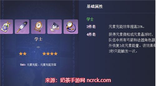 学士4件套:+20%充能效率,且能给队友充能,适用弓箭/法师主C队。