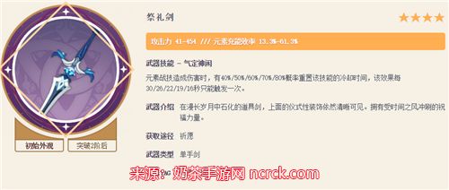 祭礼剑:充能武器,充能效率低于西风剑,但触发重置小技能CD后,可再用一次小技能,同样可以保证大招循环。