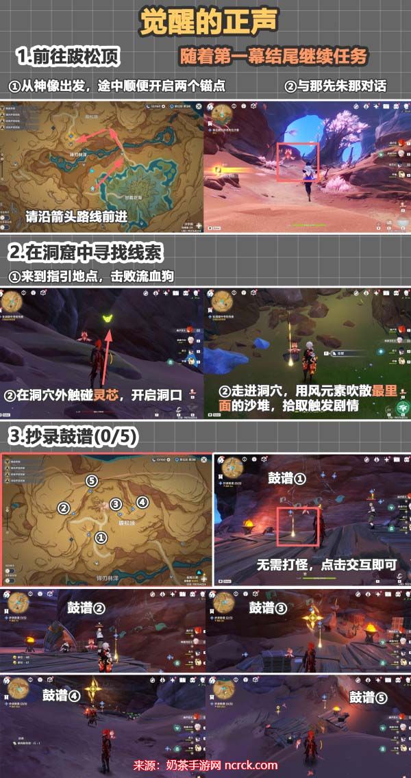 在第一阶段,我们依据指引来到洞窟寻找线索,击败怪物吹散沙堆,收集全部的5个鼓谱。