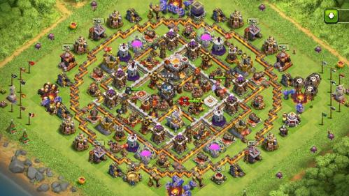 建议在7本部落战争中使用回字形阵型,营地和部落城堡放置在阵型的中间,三枚防空火箭均匀地散落在营地周围。防空火箭需要保持一定的距离,以避免敌人玩家使用闪电药和水。主楼外围两圈院墙,其余院墙垂直延伸至外围,迫击炮、农炮等防御性建筑物与其他建筑物、陷阱一起放置在外围。