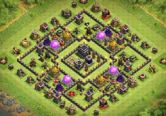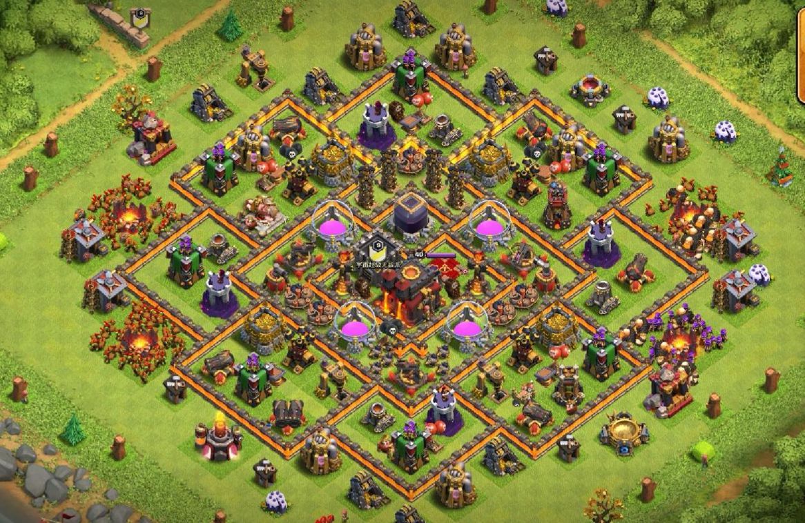 建议使用网格阵列来保护7本家乡的资源,重点是防御空军的攻击。特斯拉电塔、营地和空气炮放置在阵型的中间,黑色重油罐、防空火箭和储金罐的圣水罐穿插在营地周围。黑色油罐和防空火箭独立用庭院墙包围,圣水罐和其他防御性建筑被庭院墙包围,军营、法术工厂和其他建筑被放置在最外层。