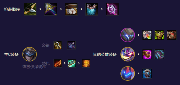 EZ的物理输出装由卑尔维斯/莎弥拉过渡,铁男可以塞肉+AP,风女挂电刀,铁男风女的装备由卡牌和前排坦克过渡,艾克单顶推荐狂徒板甲。