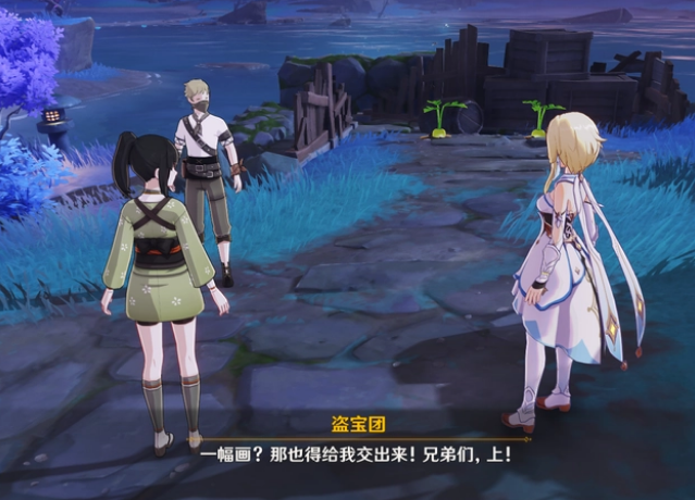 当打完野武士后将继续赶路,这时也不会一帆风顺。最后又会出现愚人众进行拦路抢劫(似乎他们都已经知道了藤原俊子的寻宝计划,QQ人,盗宝团,野武士和愚人众都像是计划好了去埋伏等待我们)虽然不是什么奇珍异宝,只是一幅画。但是能被这么多不同阵营的敌人盯上,想必这幅画不简单。