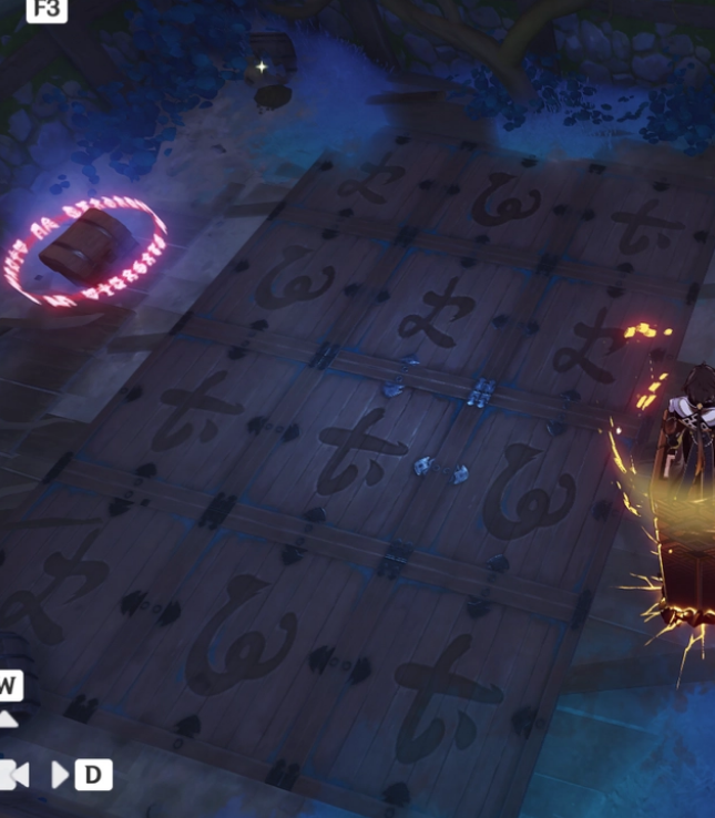 所以在荒废屋子旁边我们先拉动机关把子,然后先踩下t,然后是w最后是z。也就是上图的中,右再到左压力板的顺序。这时旁边的地道就会打开,里面会出现一个失散的雷神瞳。