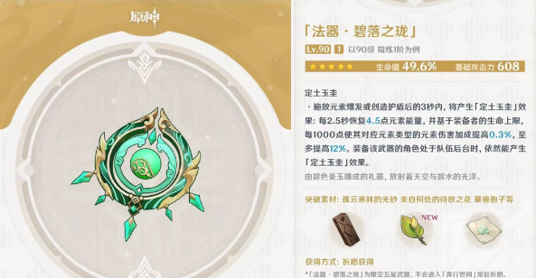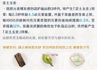 2、特殊效果,定土玉圭:释放元素爆发或创造护盾3秒内,每2.5秒恢复4.5点元素能量,还可以获取元素伤害加成=(生命值/1000)*0.3%,至多12%,就是等于吃满需要4万生命值。