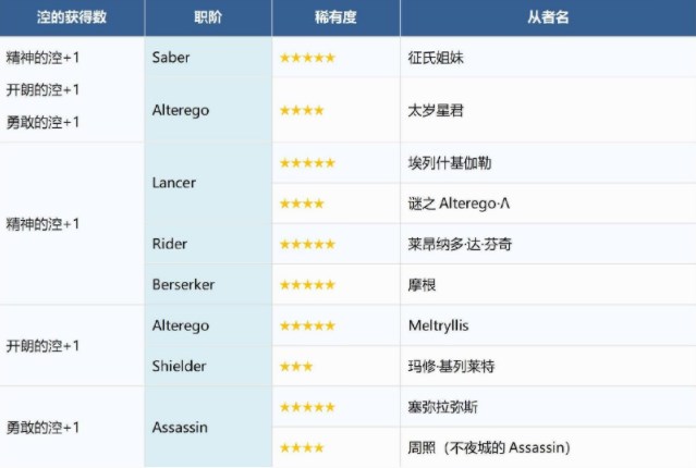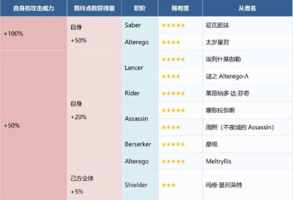 (注意,这两表中的从者不会提供重复加成,均为+1)